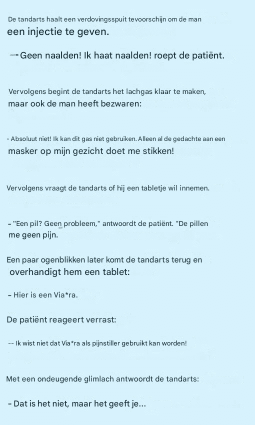 zie vervolg op de volgende pagina“Ik wist niet dat Viagra een pijnstiller was!”