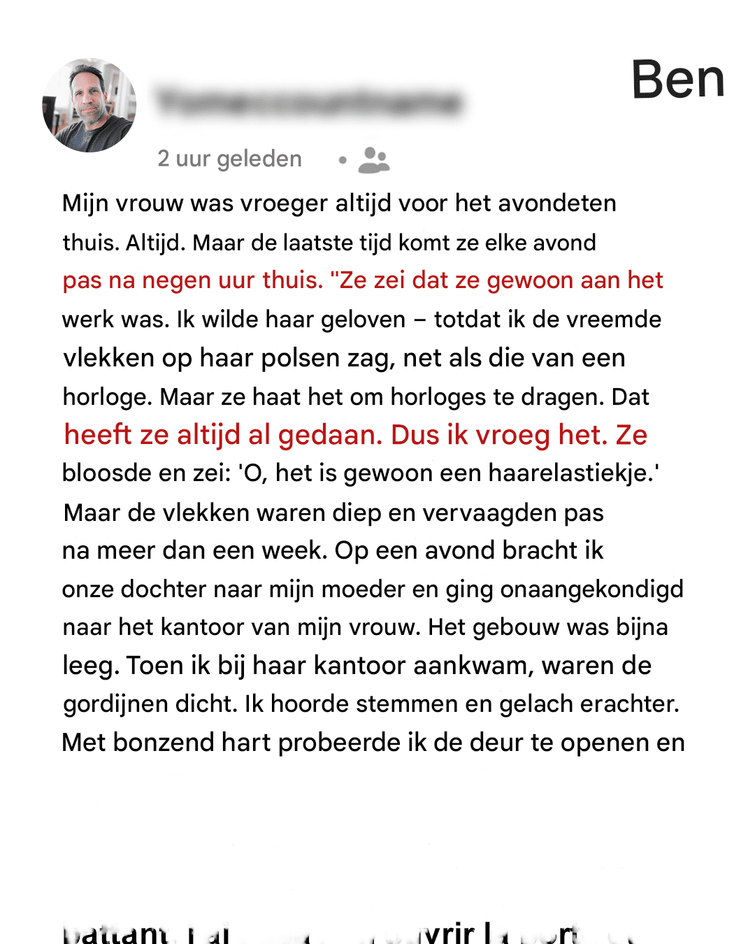 Ik wilde haar geloven. Mijn vrouw gaf me nooit een reden om haar niet te geloven. Toch kon ik het ongemakkelijke gevoel in me niet loslaten. Het moeilijkste?