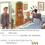 “Eh,” stamelt ze. “Ik… eh… ik denk dat ik een hartaanval krijg!” “O,” roept de goedgelovige echtgenoot, “snel, ik bel een ambulance!” Hij rent de trap af, pakt de telefoon en begint 112 te bellen als zijn zoon Johnny verschijnt, snikkend uit alle macht. “Wat is er, zoon?” vraagt de vader.